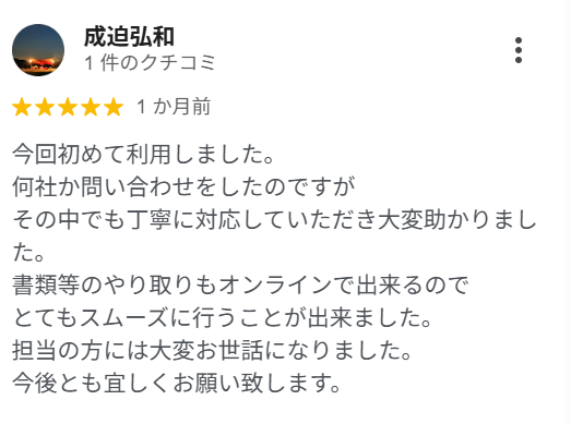 書類等のやり取りもオンラインで出来るのでとてもスムーズに行うことが出来ました。