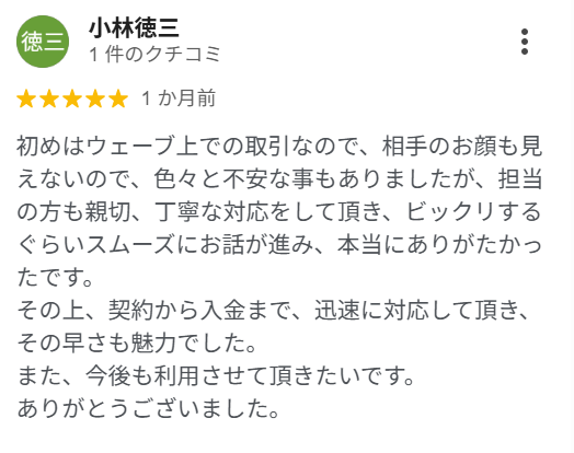 初めはウェーブ上での取引なので、相手のお顔も見えないので、色々と不安な事もありましたが、担当の方も親切、丁寧な対応をして頂き、ビックリするぐらいスムーズにお話が進み、本当にありがたかったです。