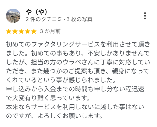 初めてのファクタリングサービスを利用させて頂きました。初めての事もあり、不安しかありませんでしたが、担当の方のウラベさんに丁寧に対応していただき、また幾つかのご提案も頂き、親身になってくれているという事が感じられました。